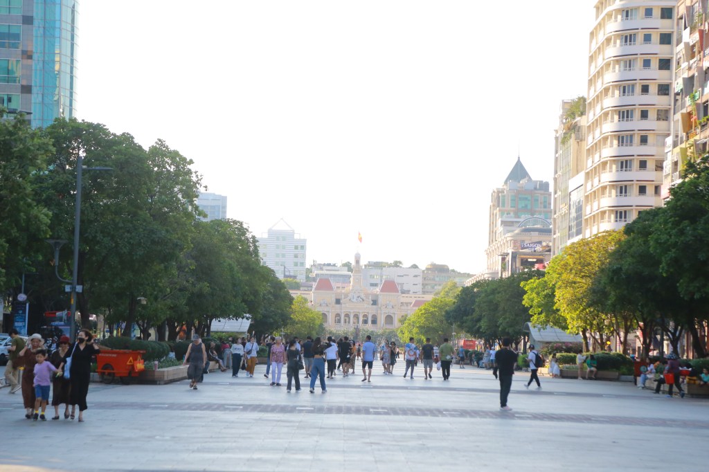 As the sun sets, Nguyen Hue Street glows with a warm golden hue, inviting you to take a stroll. The lively street is filled with people, making it the perfect backdrop for an evening photo.