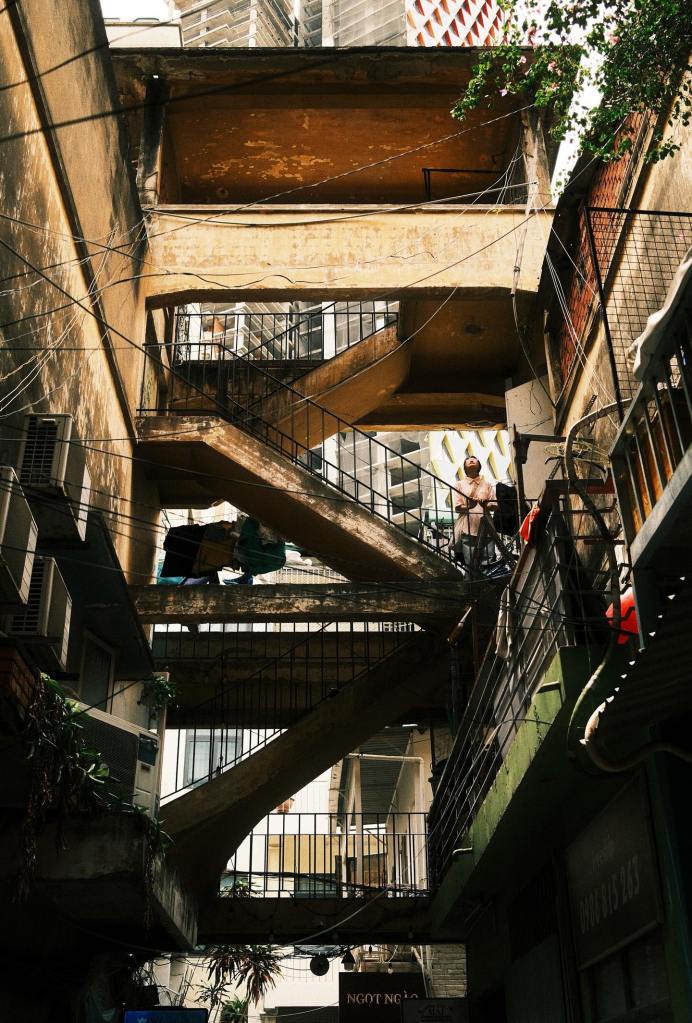 The Shift of Light Stepping from Ham Nghi Boulevard into the narrow entrance of the apartment, you experience a visual shock. From the blinding, brilliant light of the modern metropolis, everything suddenly turns dim. Cool. And damp. It isn’t a scary darkness. It is the light of memory. I call this the “Time Tunnel.” Walking through it, you leave 2026 behind.