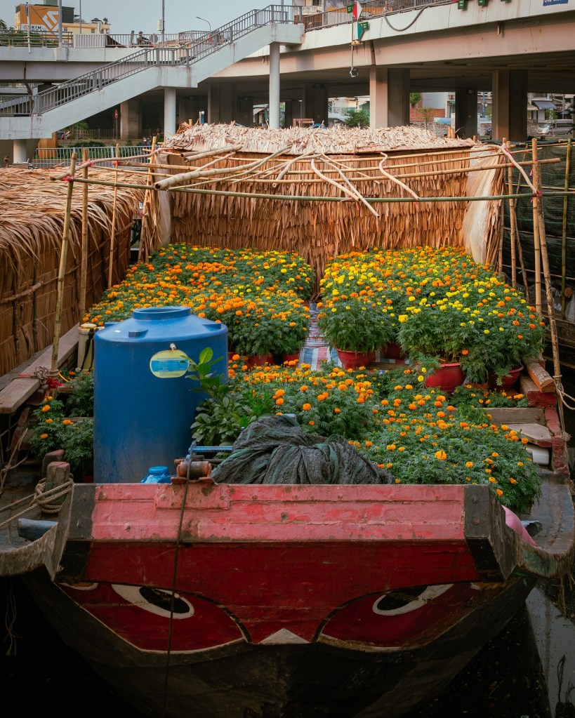 Sài Gòn có rất nhiều cửa ngõ. Nhưng có một cửa ngõ mà Mùa Xuân thường chọn để “lẻn” vào thành phố sớm nhất, đó là đường thủy. Hôm nay, nếu bạn đứng trên cầu Chà Và nhìn xuống dòng kênh Tàu Hủ, bạn sẽ thấy một cảnh tượng choáng ngợp: Một dải lụa màu vàng rực rỡ đang dập dềnh trên sóng nước. Đó là những chiếc ghe bầu chở đầy hoa mai, hoa cúc, tắc kiểng từ miền Tây (Bến Tre, Chợ Lách, Sa Đéc) vừa cập bến Bình Đông.