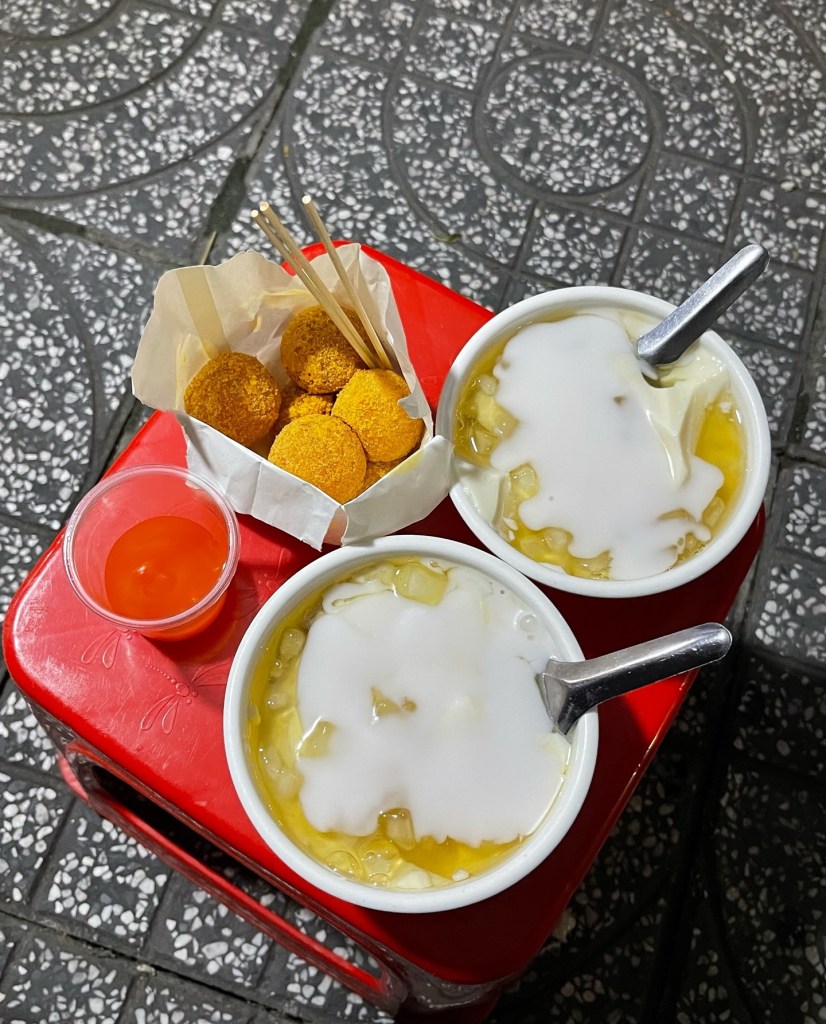This afternoon, Saigon suddenly poured an unseasonal shower. Amidst the pattering rain, I heard a sound echoing from deep within the alley: “Who wants… Tofu pudding… sugar syrup…?” (Ai… Tàu hủ… nước đường… hôn…?) The street cry was drawn out, high-pitched, slightly melancholic but incredibly magnetic. It made me jump up, slip on my flip-flops, and run to the alley entrance like a 5-year-old kid. On the vendor lady’s shoulder was a heavy bamboo pole, but inside that insulated pot was a whole steaming, pure white “cloud.”