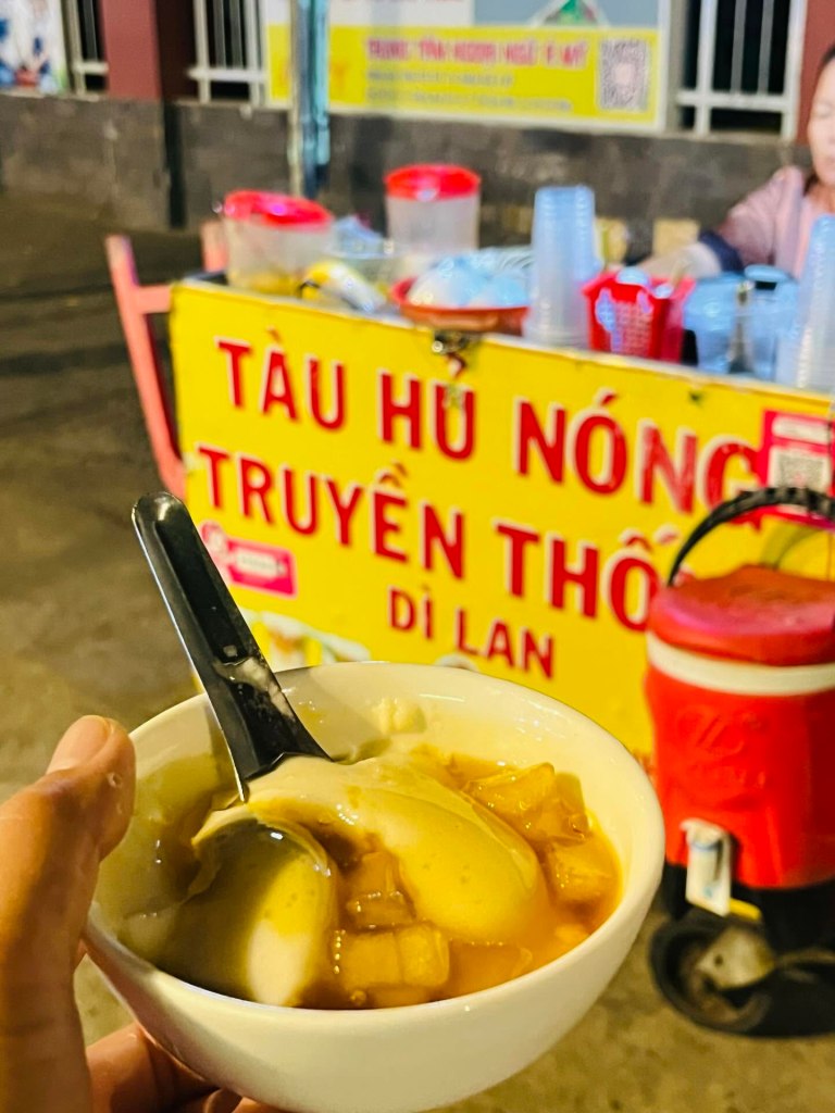 Ăn một “Đám Mây” ngọt ngào Hãy tưởng tượng cái muỗng nhôm mỏng tang hớt từng lát tàu hủ trắng ngần, mỏng như lụa, xếp chồng lên nhau trong cái chén nhỏ. Chan thêm một vá nước đường vàng óng thơm phức mùi gừng. Rưới thêm chút nước cốt dừa béo ngậy. Cầm chén tàu hủ nóng trên tay, hơi ấm truyền qua da thịt. Đưa vào miệng. Tan chảy. Tàu hủ không cần nhai. Nó tự trôi tuột xuống cổ họng, để lại dư vị ngọt thanh và cay nồng của gừng ấm. Cảm giác đó giống như bạn đang ăn một “đám mây”. Nó nhẹ bẫng, thanh tao, gột rửa hết mọi sự nặng nề, cục mịch của những áp lực công việc ban ngày.