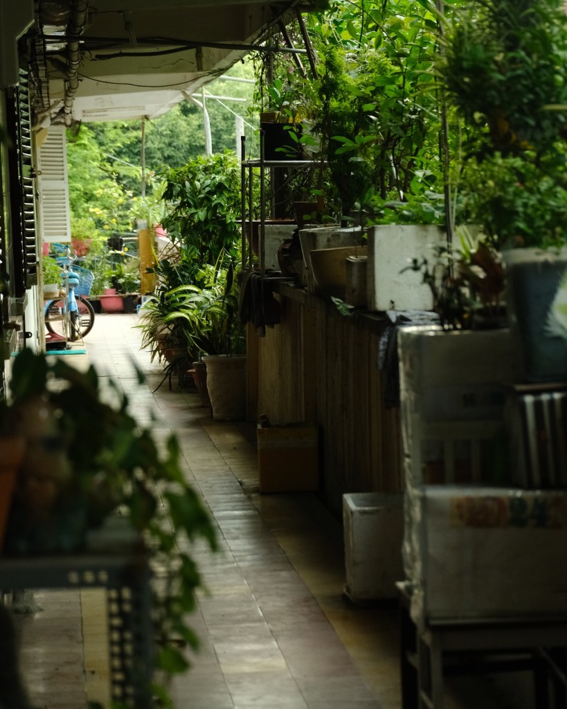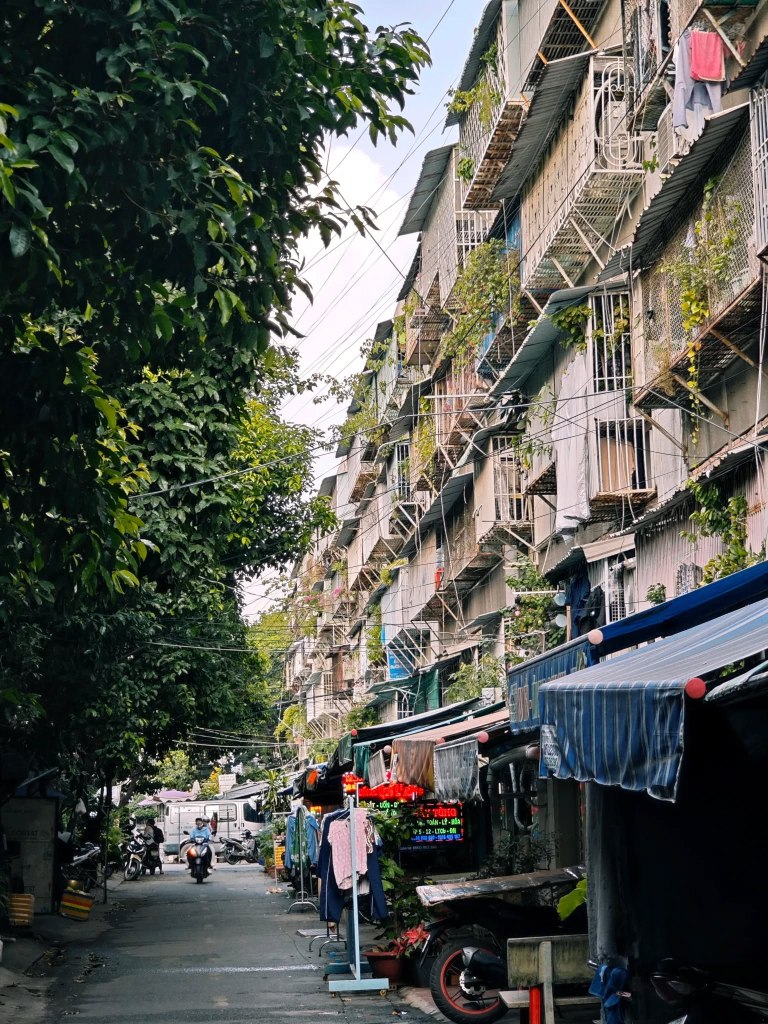 “Matchboxes” Holding a Thousand Lives From afar, old apartments look like stacked matchboxes. Each window is a separate world. This one hangs a birdcage. That one dries colorful clothes. Another has an old lady watering plants. That “messiness” creates a vivid Texture that no skyscraper can possess. It is proof of life stirring, breathing. Stepping into the dark staircase, smelling the incense, the braised fish, hearing the faint opera singing… I feel like I’m traveling back in time to 90s Saigon.
